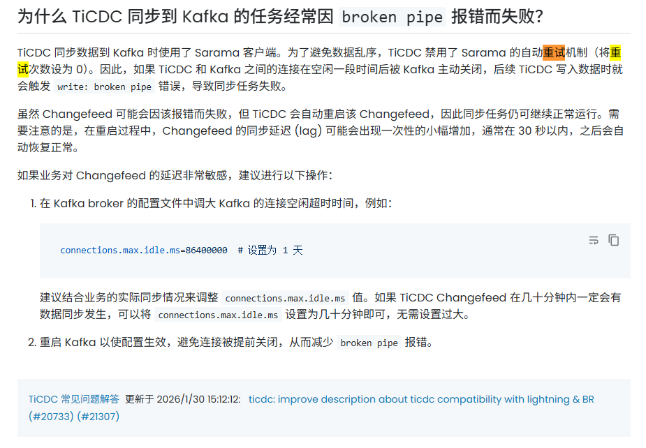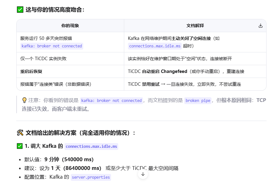 connections.max.idle.ms=86400000💡 建议值:86400000 = 24 小时,远大于 TiCDC 最大空闲间隔。